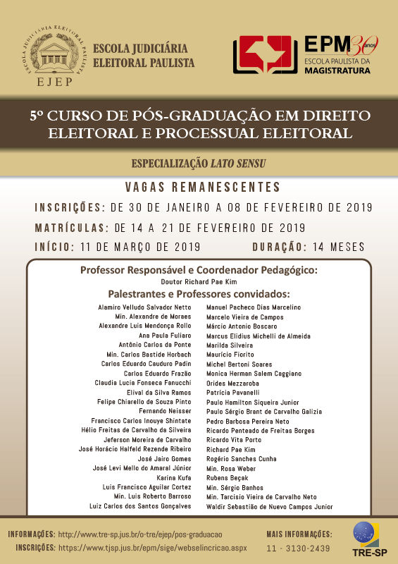 Encerram-se no dia 8 de fevereiro as inscrições para o 5º Curso de Pós-Graduação em Direito Eleitoral e Processual Eleitoral, uma iniciativa conjunta da Escola Judiciária Eleitoral Paulista, ligada ao TRE-SP (Tribunal Regional Eleitoral de São Paulo), e da Escola Paulista da Magistratura, do Tribunal de Justiça do Estado de São Paulo.